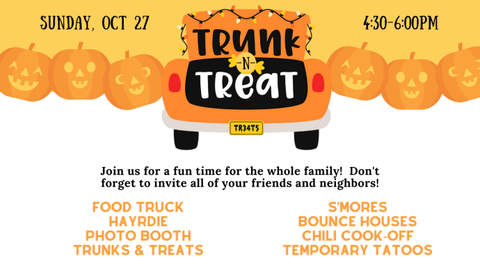 Join us for a fun time for the whole family! We'll enjoy a chili cook-off, bounce houses, s'mores, a hay ride, food truck, lots of treats, a temporary tattoos, and more. Don't...